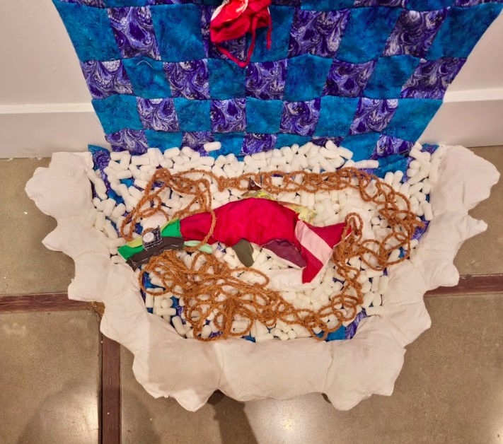 Fabric, packing peanuts, rope